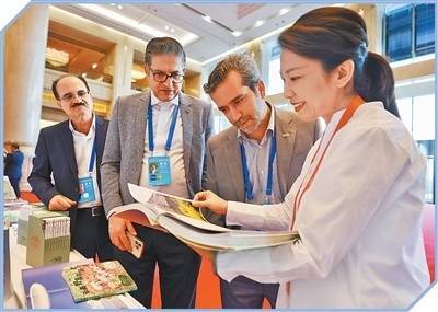2025“一带一路”媒体合作论坛主会场,与会嘉宾通过书籍了解云南省情。 本报记者 蒋雨师摄