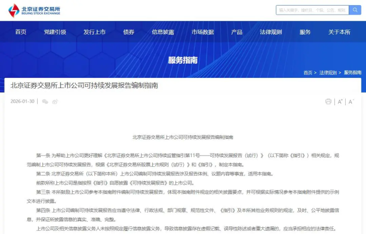 同日,在中国证监会的指导下,沪深北交易所修订发布上市公司可持续发展报告编制指南(以下简称指南),新增《第三号污染物排放》《第四号能源利用》《第五号水资源利用》三个应用指南,中英文版本同步向市场公开。