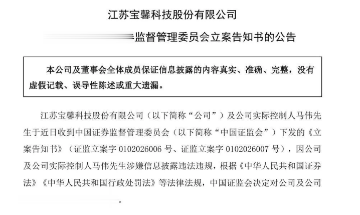 宝馨科技发布的公告称,公司及公司实际控制人马伟于近日收到中国证监会下发的《立案告知书》,因涉嫌信息披露违法违规,中国证监会决定对公司及公司实际控制人马伟立案。